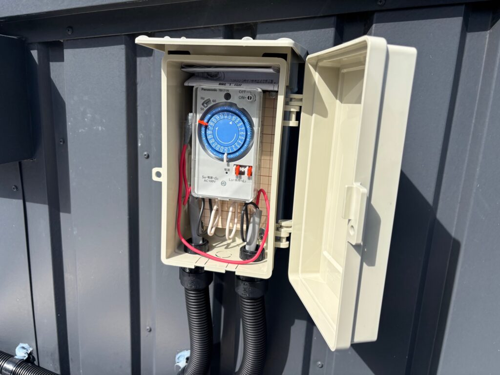 元々は建物でメーターが分かれていましたがどういうわけかメーターへの接続が混在に・・・今回はそれを改善するためにメーターへの接続工事とエアコン新規工事に伴うブレーカーの交換を実施しました。その他工事としてメーターを分岐したことによる屋外照明のタイマースイッチの新設、ウォールボックスの新規設置工事を行いました。