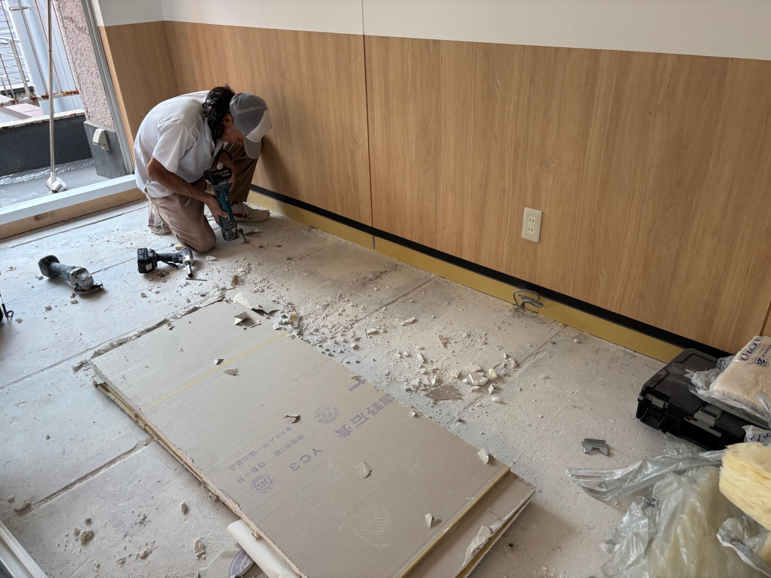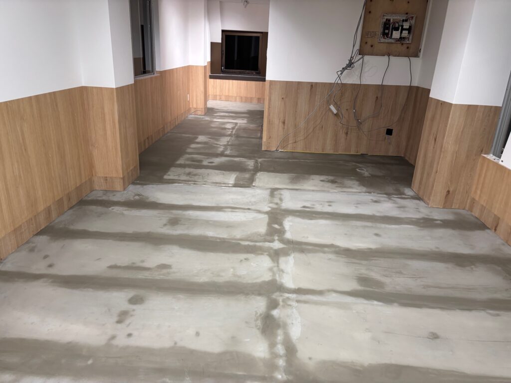 オフィスの床の下地が悪いため、土間(モルタル)打ちをして下地補修を行いました!