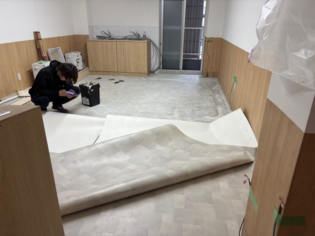 オフィスの土間打ち完了後の床にクッションフロア、5フロア分を施工しました!