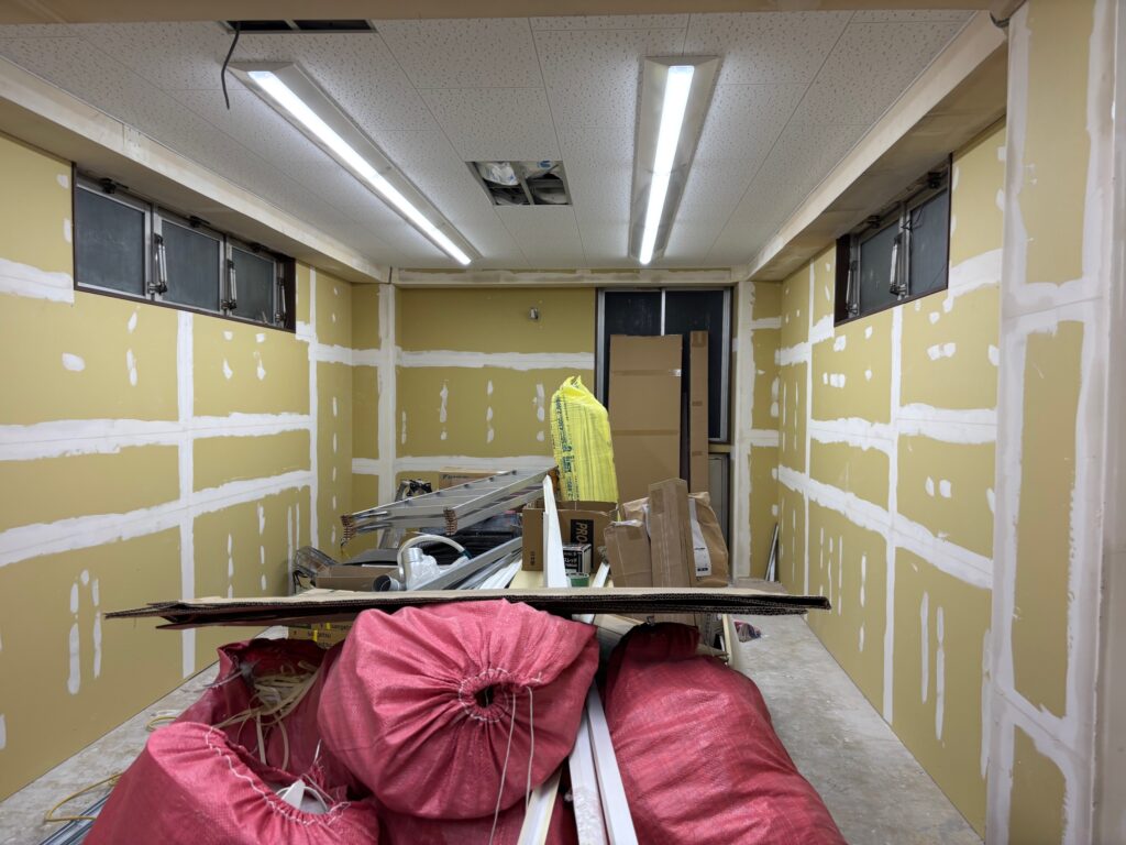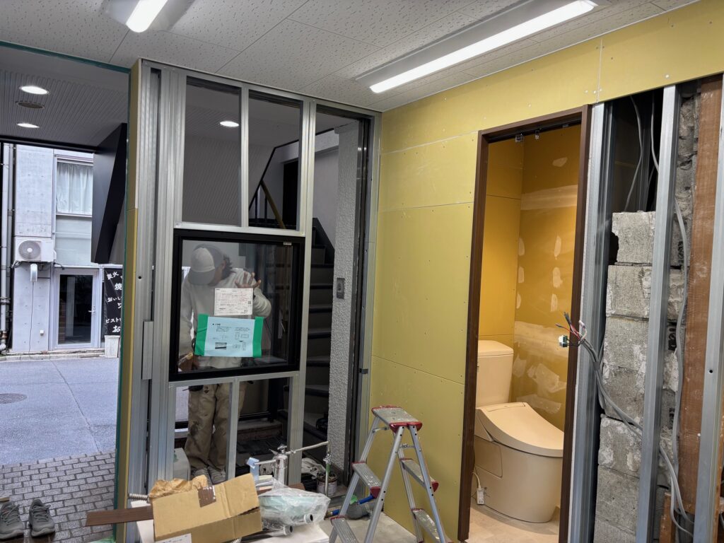 天井は下地材を組んでジプトーンで施工、壁廻りは極力部屋を大きく使用したいので45のスタッドで新規の壁面を造作、床面は下地処理をしっかりと行いクッションフロアの施工をしました。事前に先行配線を行い仮設照明の設置から全て0からの工事を実施、設備工事では給水と排水の延長や変更を行いトイレの設置、手洗いの設置を行いました。