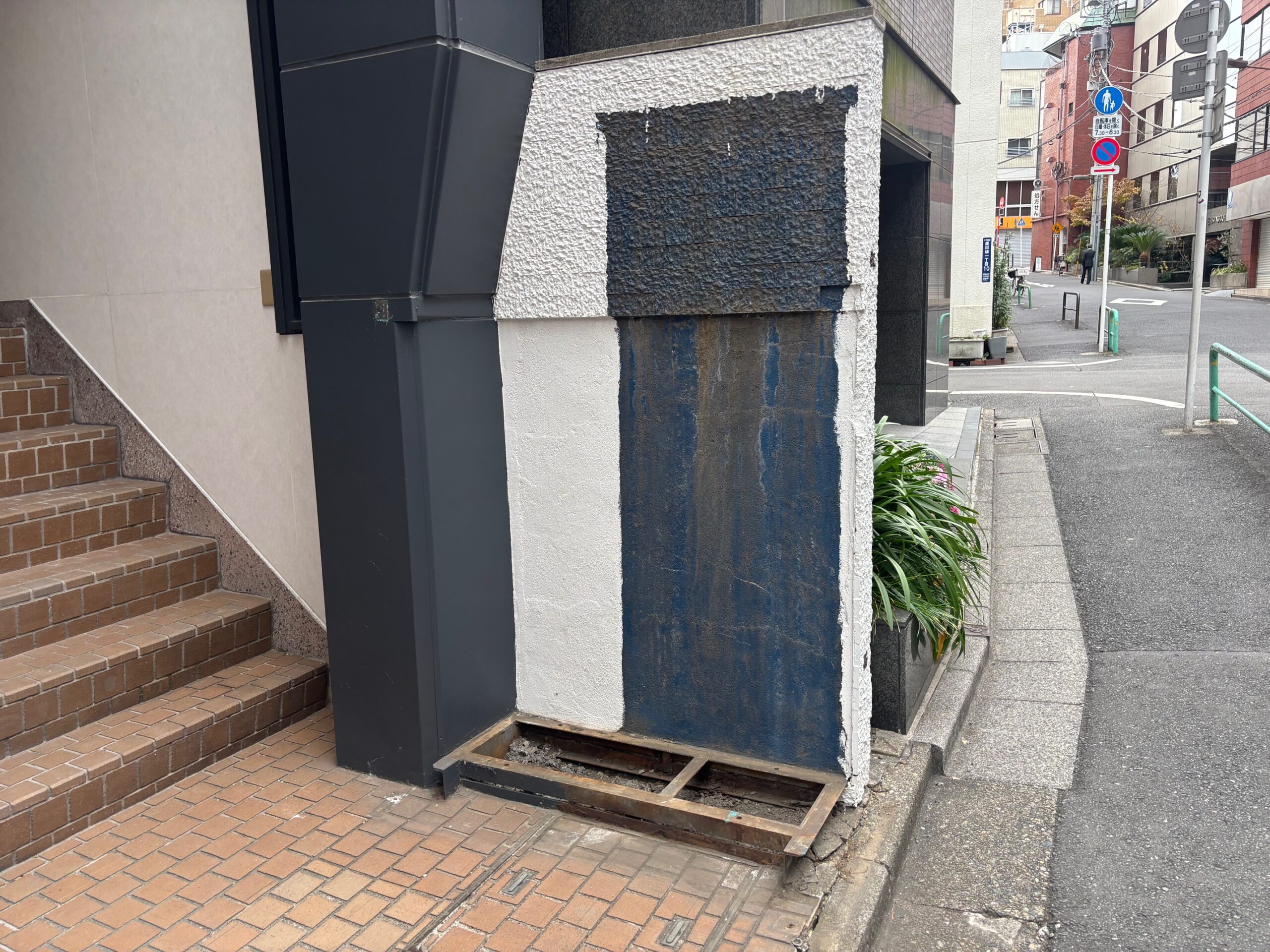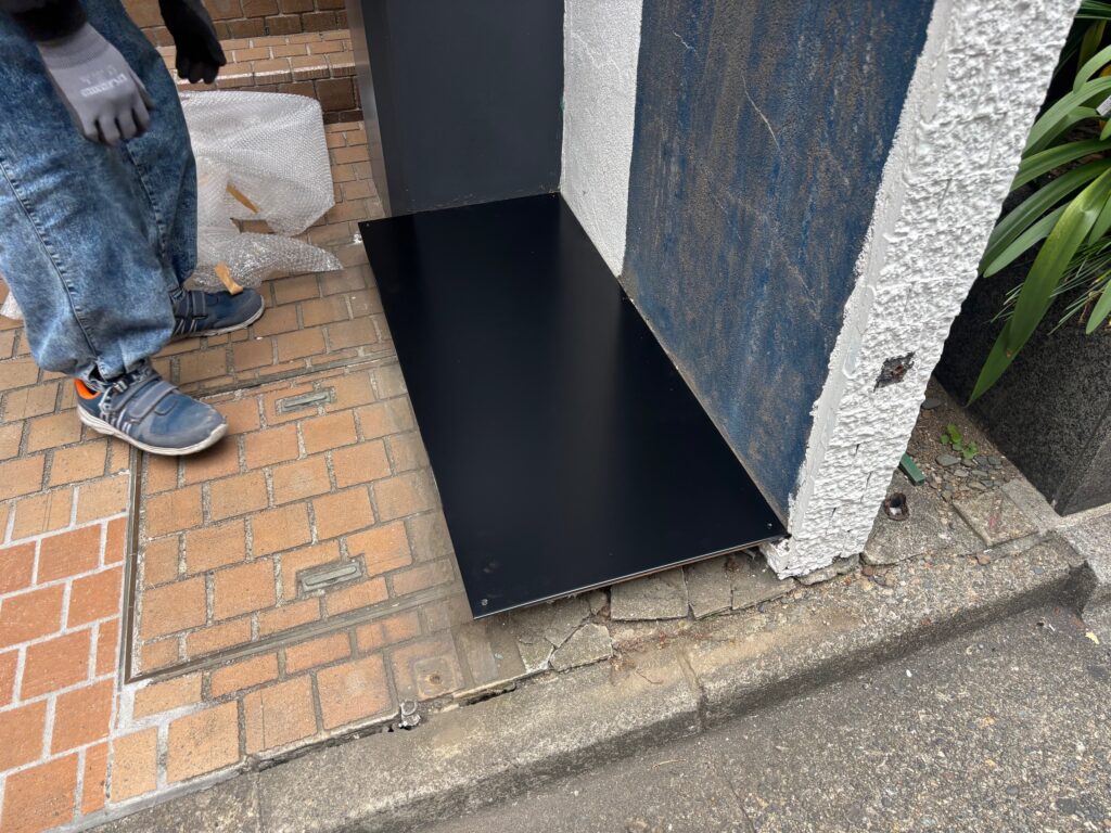 ビル脇の物置撤去後に穴が出現!焼付塗装の鉄板で穴塞ぎをしました!!