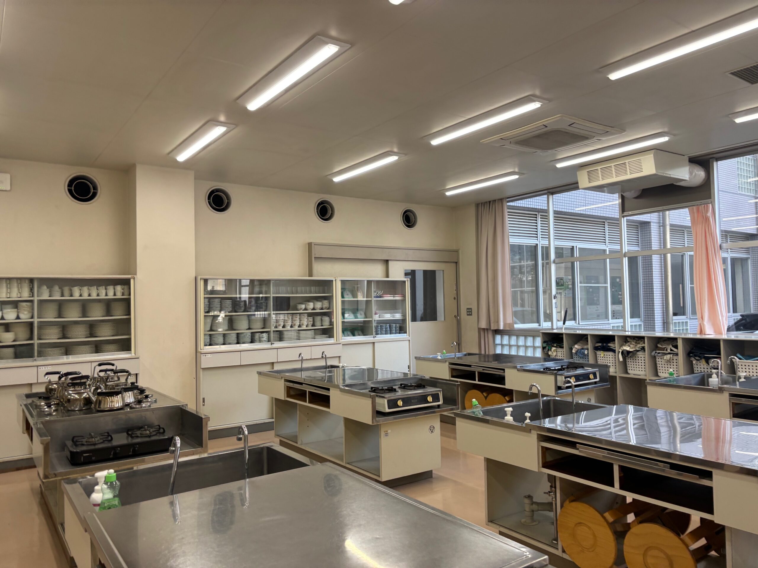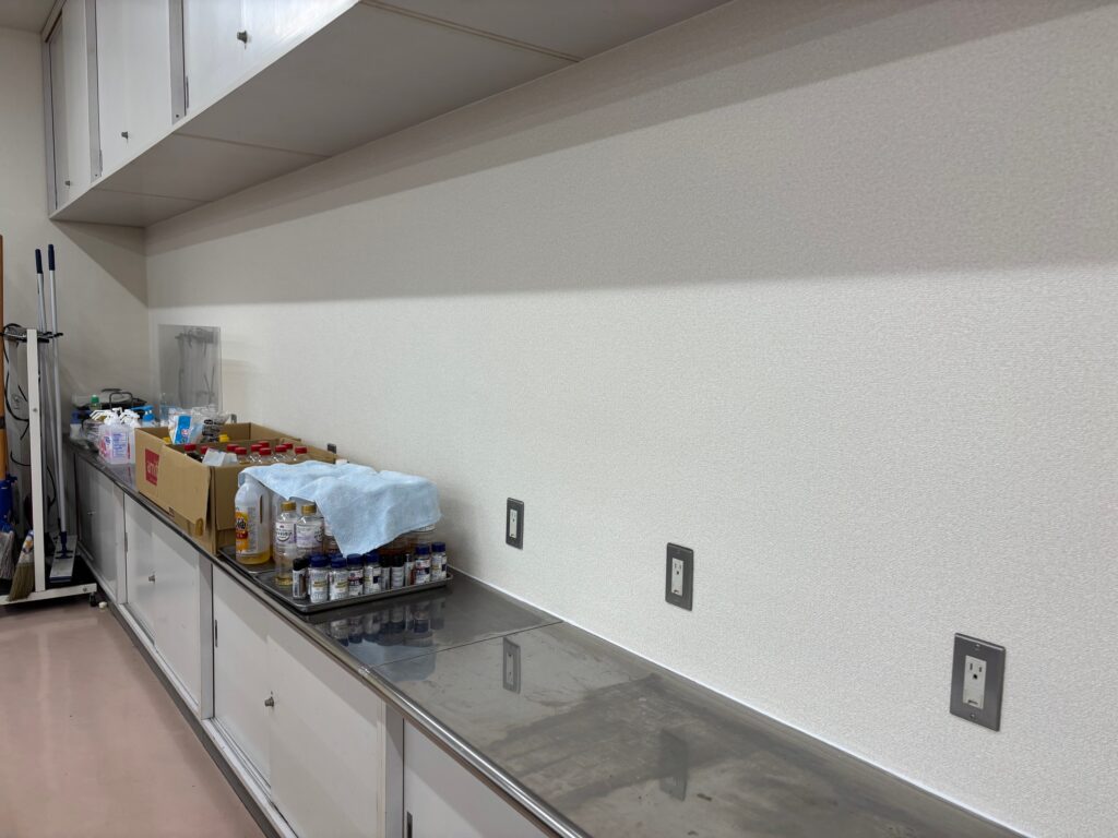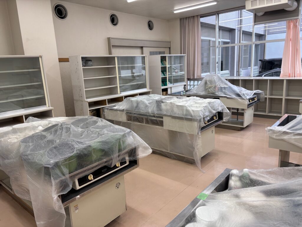 学校様の調理室の壁面にクロス施工を行いました。