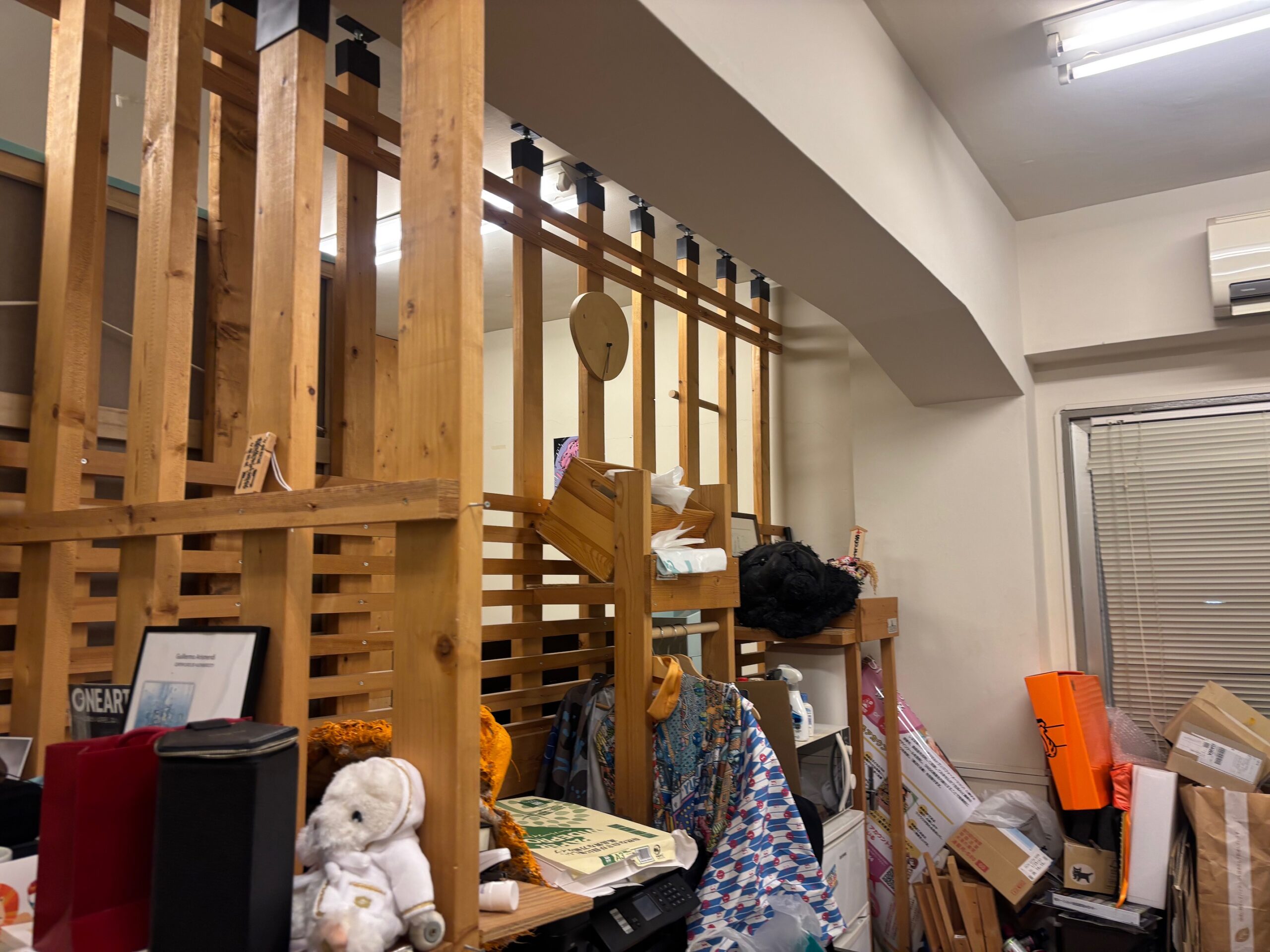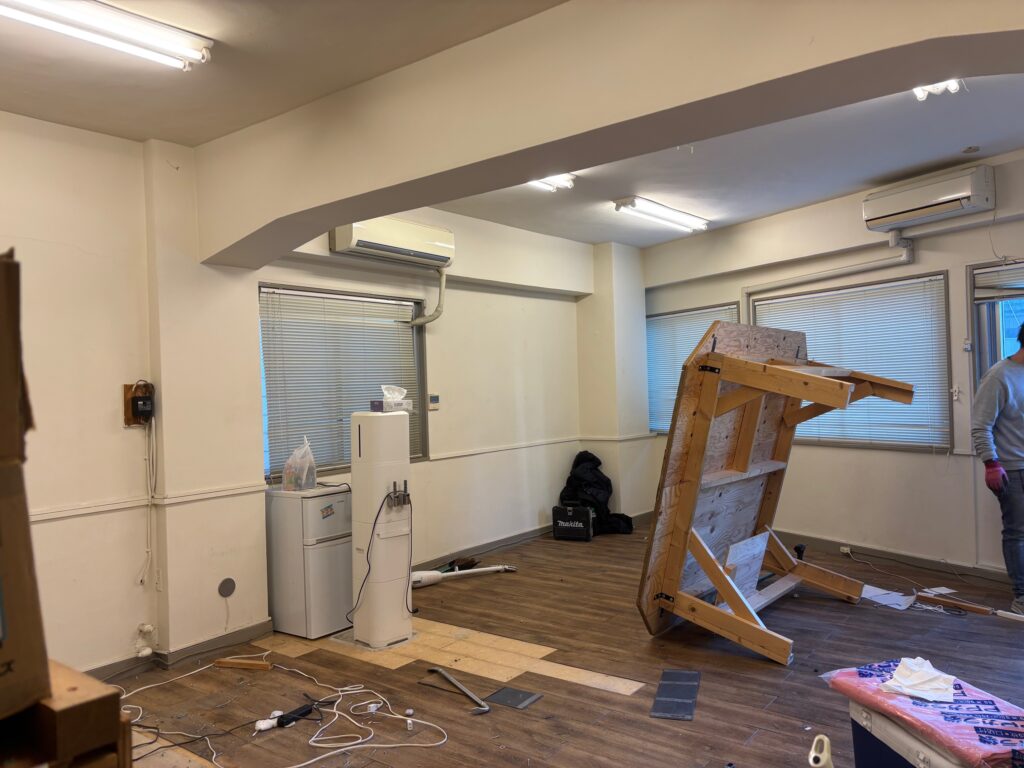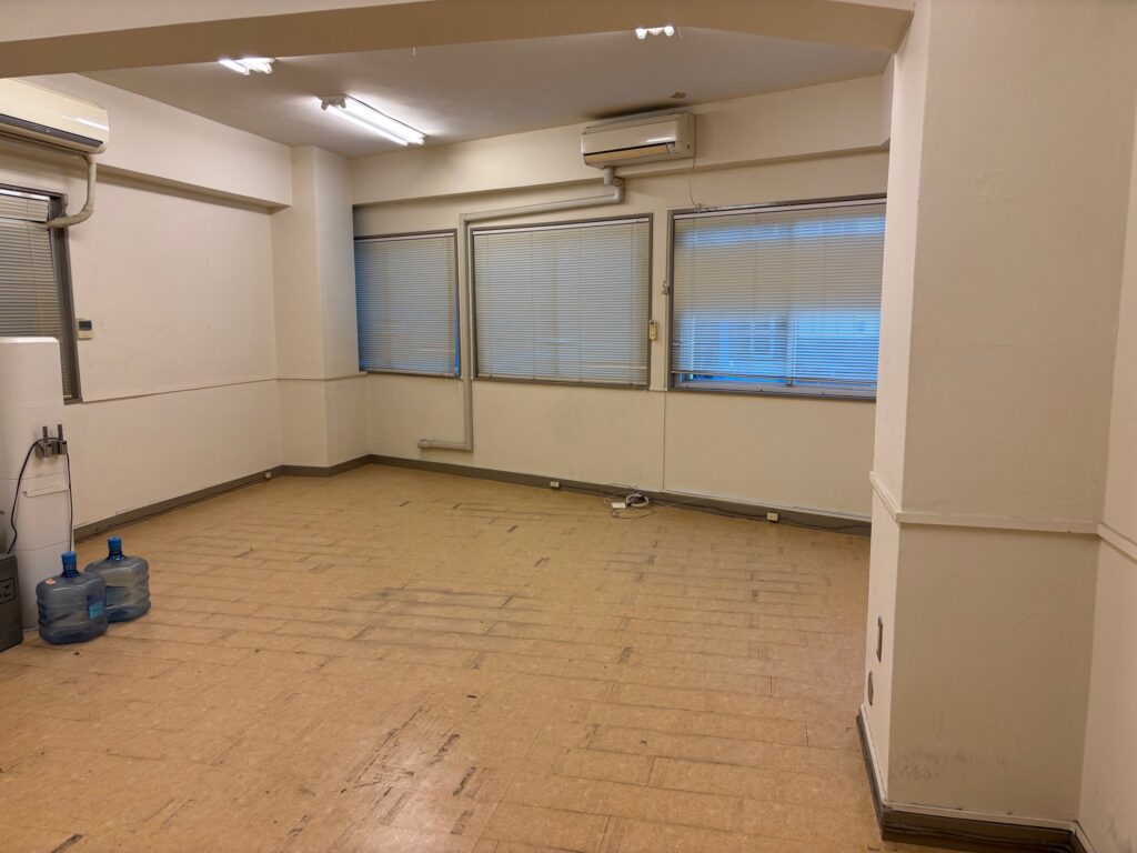 自社で造作した木材の造作物の解体撤去、その他の廃棄品の搬出を2名で実施、階段作業で痺れる作業でしたがみるみるオフィスから物がなくなっていくのは気持ちがいいですね。環境にも配慮して極力分別を行い引取を実施しました。完了後はきれいさっぱりのオフィスとなりました。
