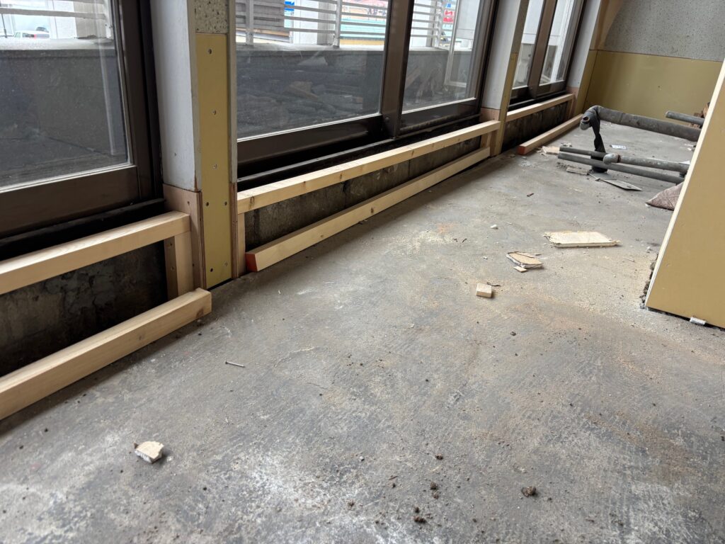 解体時に床が窓枠の上で造作されていることが判明。窓枠がない状態で困りものでした。しかし長年の技術から窓枠を追加で延長することで問題を解決。スラブも窓下は寸足らずでしたが、モルタルを入れて下地を作って小上がりも現地合わせで造作しました。窓枠は塗装で仕上げて何事もなかったかのように。これよりクロス、床材を仕上げて奇麗なオフィスに仕上げます。