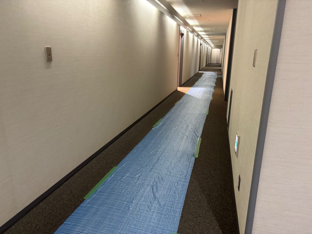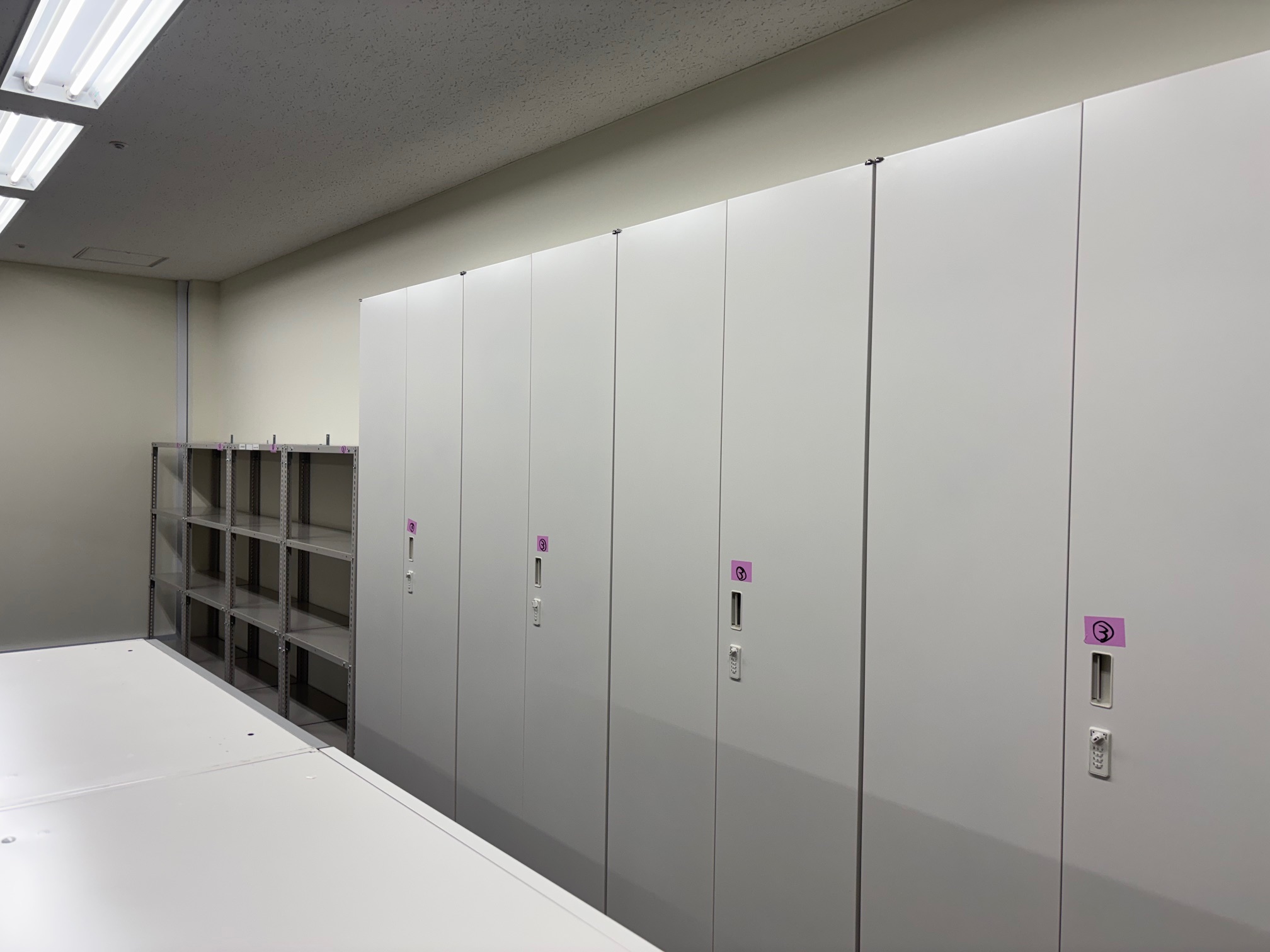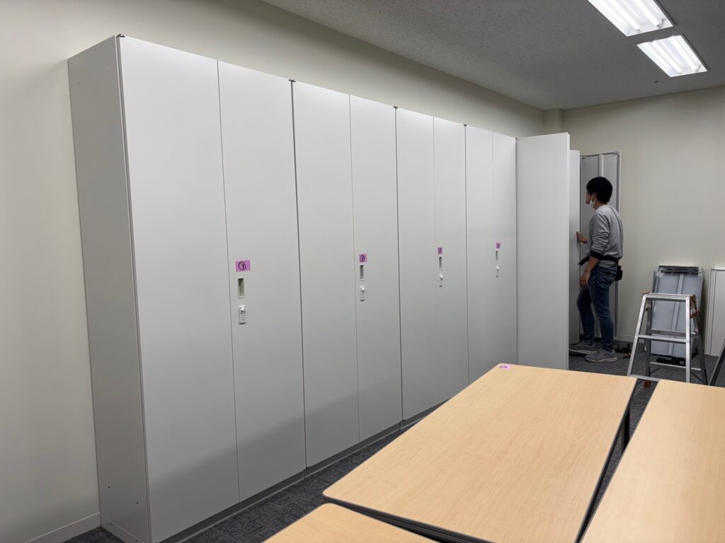 内筒としては高層ビルのフロア間の移動がメインとなり、業務用のEVを利用しての作業となりました。背の高いロングキャビネットが10本、その他キャビネット、テーブル、チェアなど総数で50点ほどありましたが午前中で全て作業が完了いたしました。キャビネットは耐震対策としてキャビネット同士の横連結、背面での壁固定を行い安全対策もしっかりと行いました。